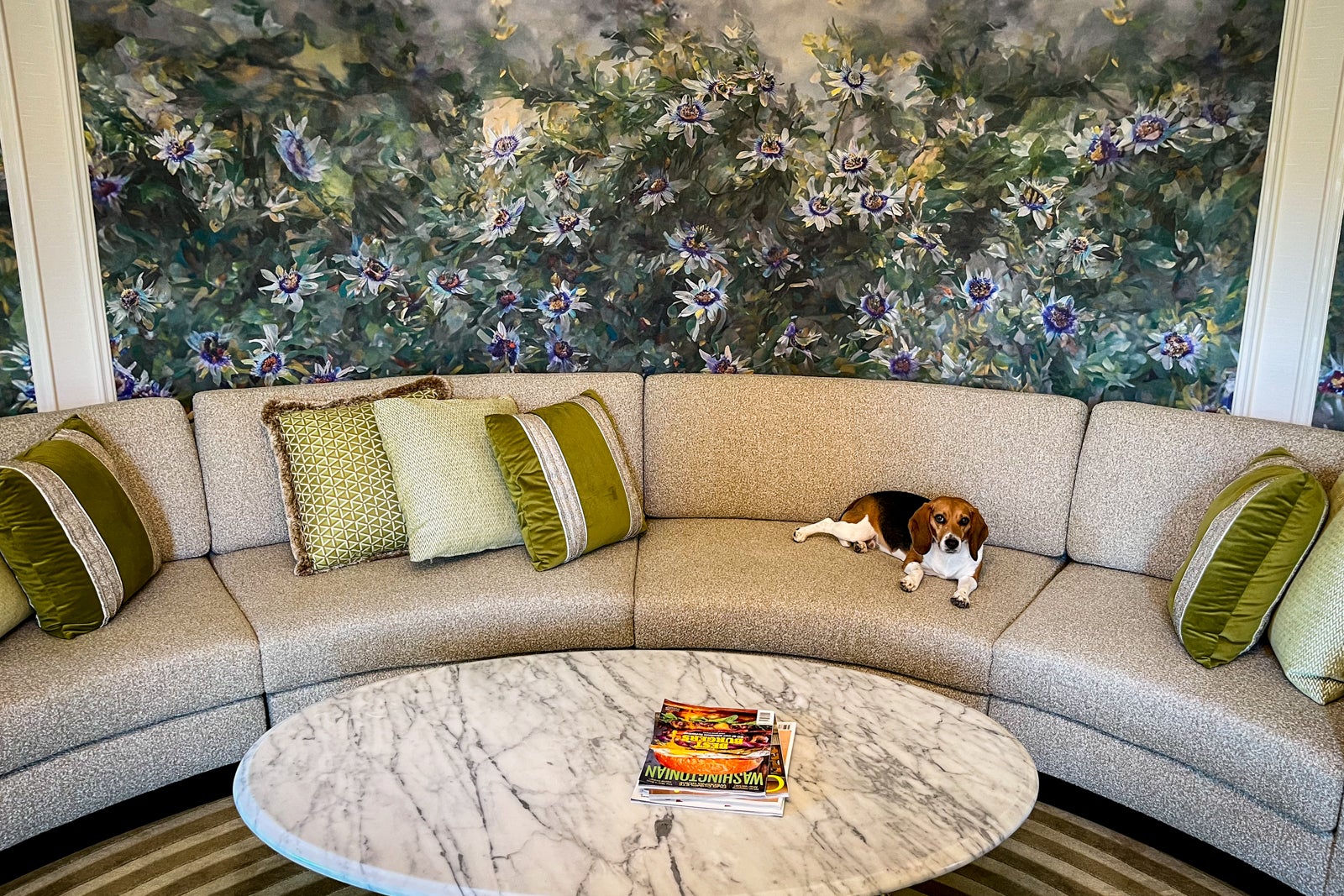 Turning again towards the lobby, simply past the portrait of Howe, I found the spotlight of the suite: a spectacular lounge related in form to the famed Oval Workplace on the White Home. I liked the customized curved couch topped with pillows in numerous inexperienced hues and the attractive mural impressed by Howe’s “Ardour-Flowers” e book of poetry, in addition to the cloudlike shadows depicted on the ceiling when the beautiful chandelier illuminated the room. All collectively, they created a calming, inviting area excellent for lounging — or taking part in, as Bailey most well-liked.