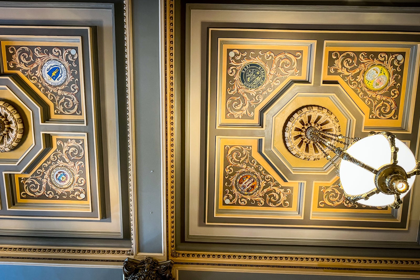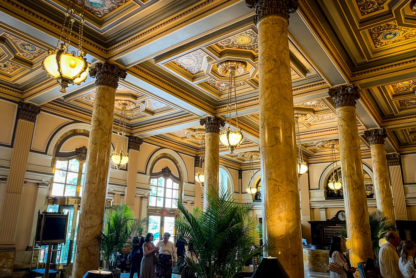 • Whereas within the foyer, make sure to pay shut consideration to the coffered ceiling. Every mild fixture hanging from it’s surrounded by 4 state seals, every representing one of many Decrease 48 states. The seals for the opposite two U.S. states, Alaska and Hawaii, could be discovered on the again pillars of the lodge’s Peacock Alley.