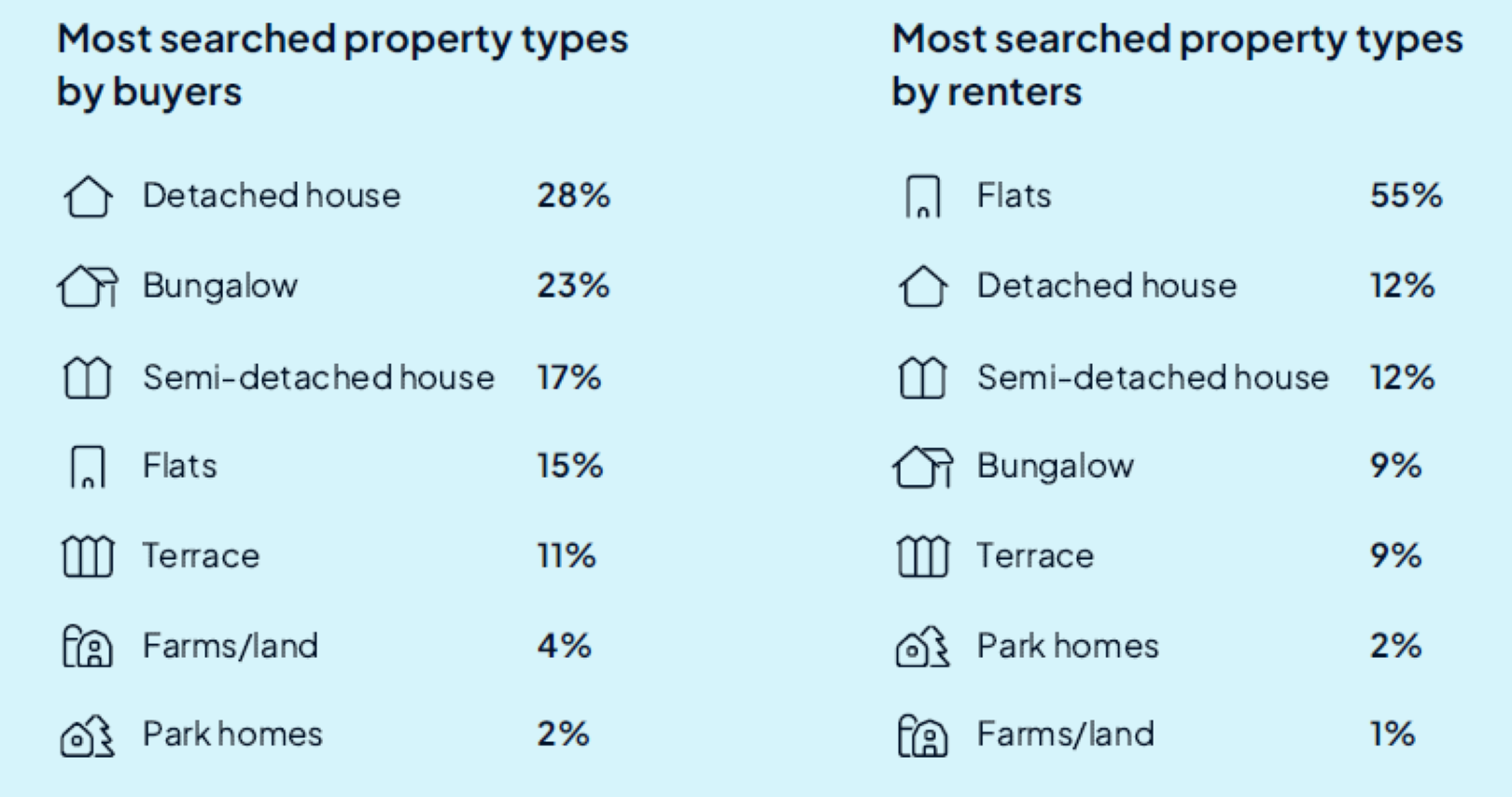 Renters, then again, present a powerful desire for residences, which dominate 55% of filtered searches. Indifferent and semi-detached homes share related demand with 12% every, adopted by bungalows and terraced homes, each with 9% of filtered searches.